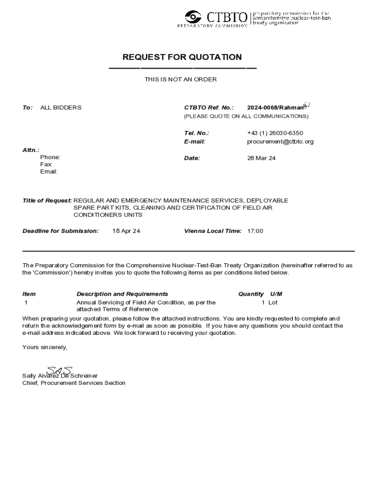 REQUEST FOR QUOTATION___ THIS IS NOT AN ORDERTo:ALL BIDDERSCTBTO Ref. No.:20240068/Rahman(PLEASE QUOTE ON ALL COMMUNICATIONS)Tel. No.: Email:+43 (1) 260306350 procurement@ctbto.orgDate:28 Mar 24Attn.:
