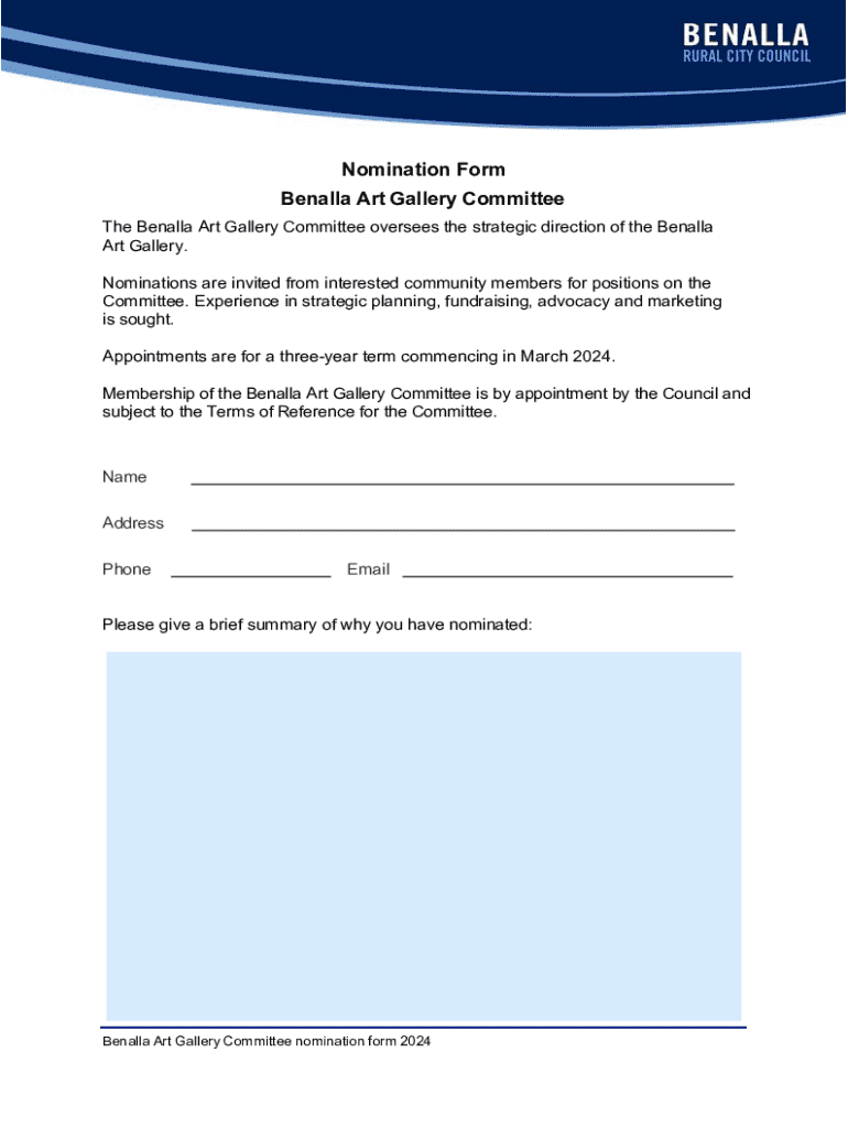 The nomination form for Benalla Art is an official document used to submit candidates or proposals for consideration in the Benalla Art Gallery exhibitions or awards.