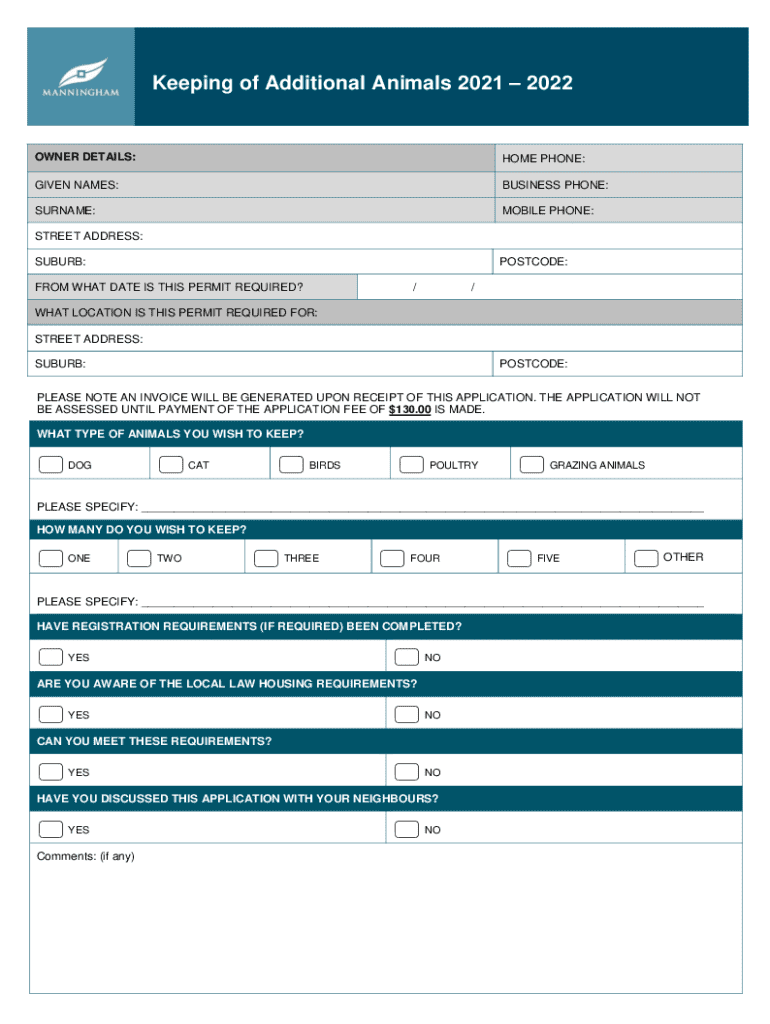 Keeping of Additional Animals 2021 2022OWNER DETAILS:HOME PHONE:GIVEN NAMES:BUSINESS PHONE:SURNAME:MOBILE PHONE:STREET ADDRESS: SUBURB:POSTCODE:FROM WHAT DATE IS THIS PERMIT REQUIRED?//WHAT LOCATION