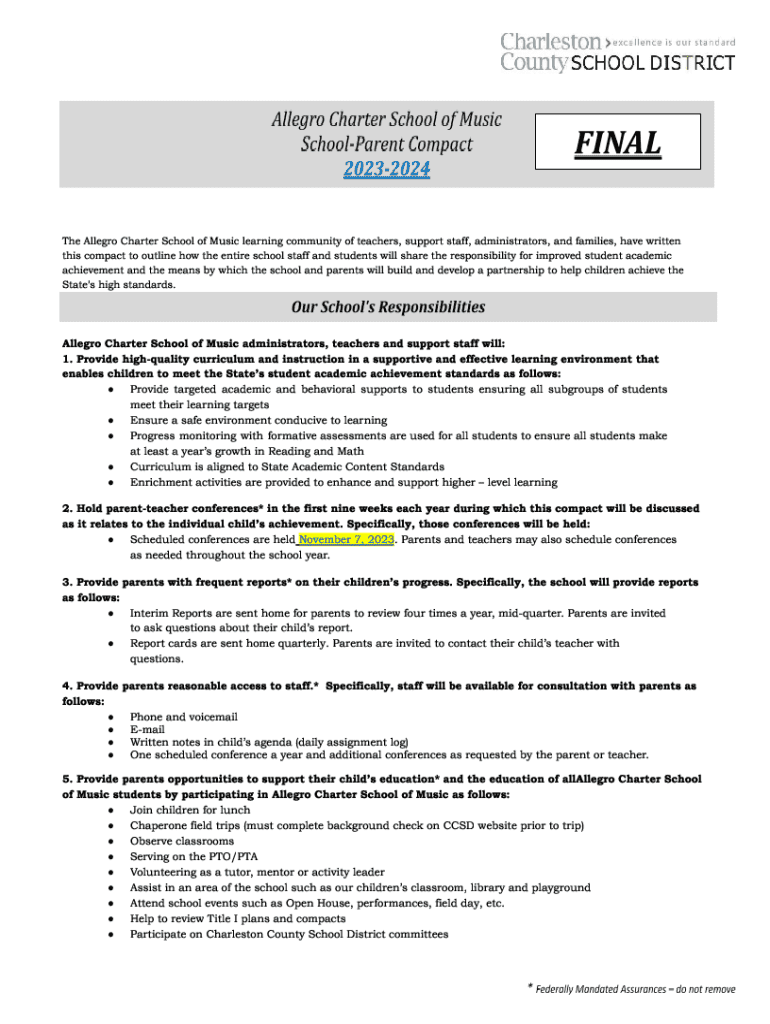 The Allegro Charter School of Music learning community of teachers, support staff, administrators, and families, have written this compact to outline how the entire school staff and students will