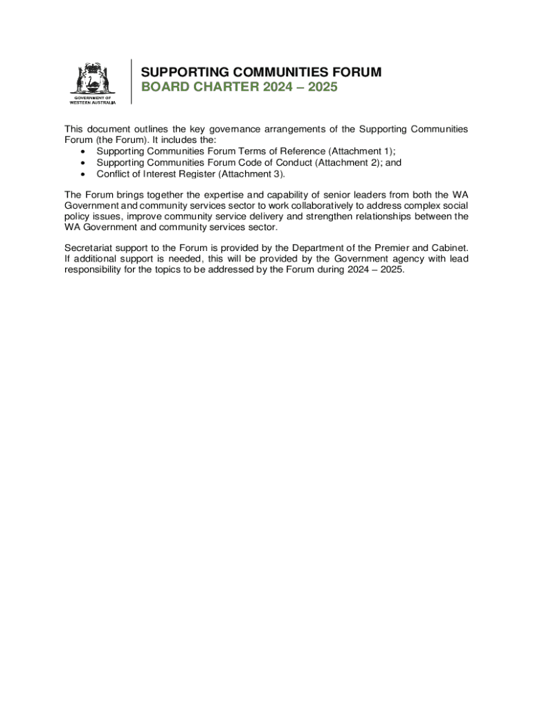 SUPPORTING COMMUNITIES FORUM BOARD CHARTER 2024 2025This document outlines the key governance arrangements of the Supporting Communities Forum (the Forum). It includes the: Supporting Communities