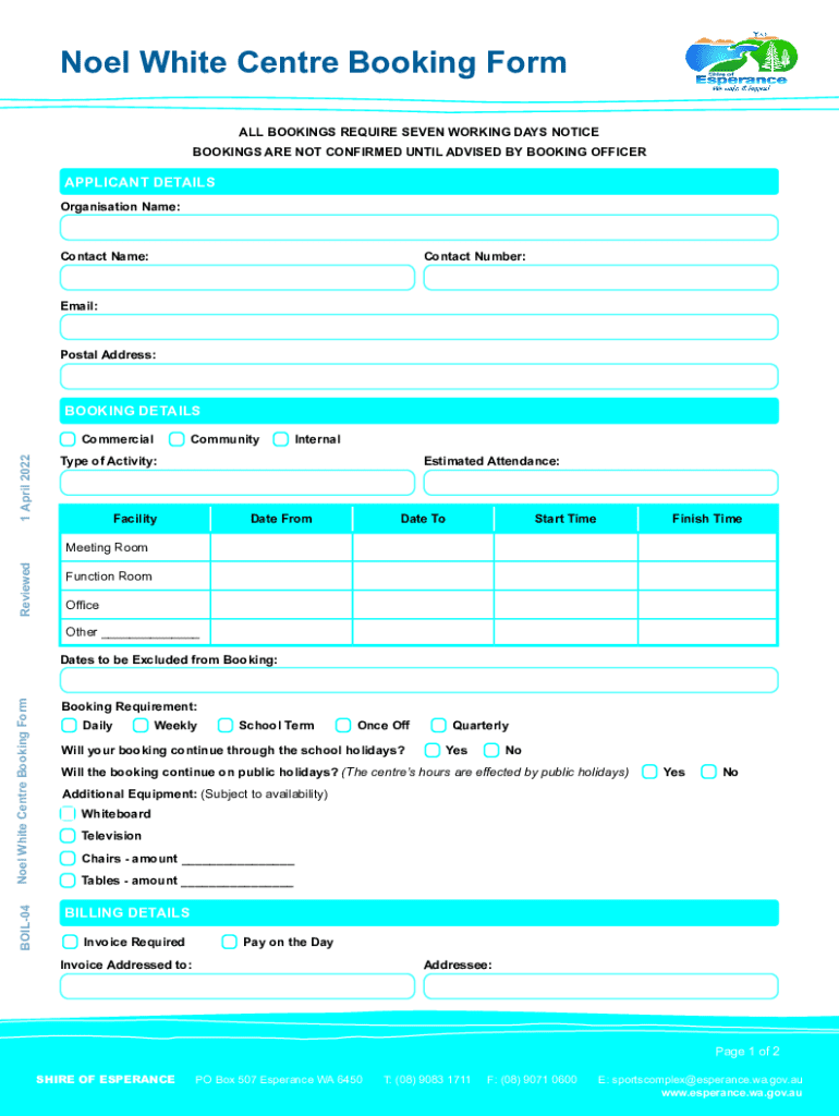 Noel White Centre Booking Form ALL BOOKINGS REQUIRE SEVEN WORKING DAYS NOTICE BOOKINGS ARE NOT CONFIRMED UNTIL ADVISED BY BOOKING OFFICERAPPLICANT DETAILS Organisation Name:Contact Name:Contact Number:Email:Postal