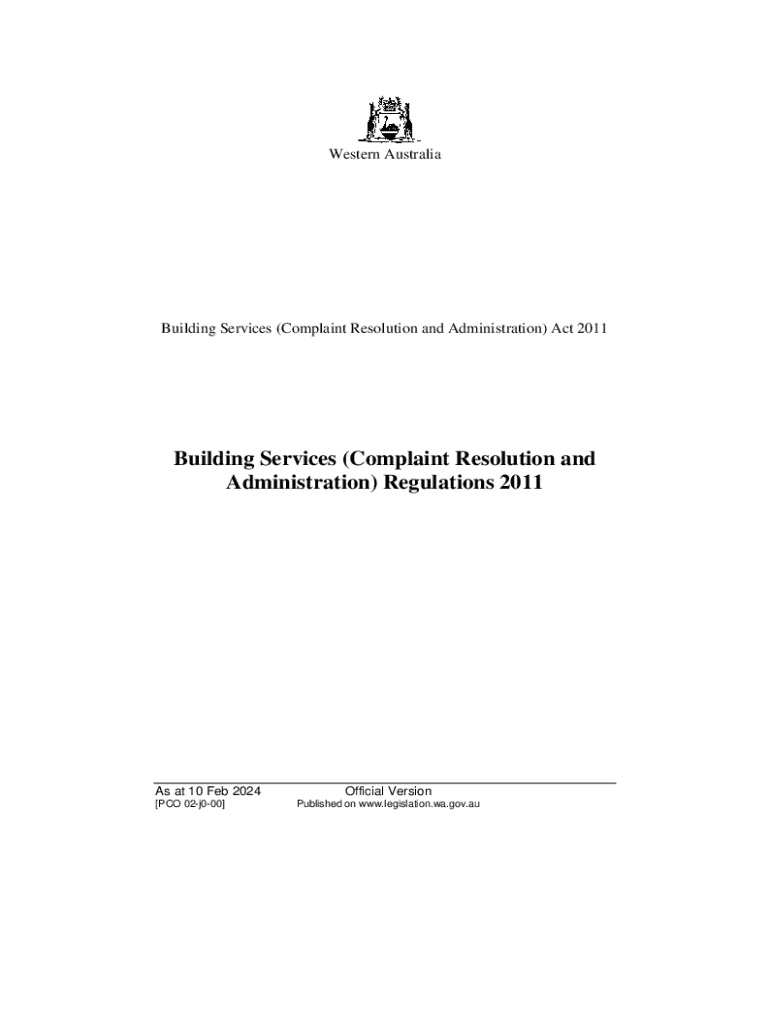 Western AustraliaBuilding Services (Complaint Resolution and Administration) Act 2011Building Services (Complaint Resolution and Administration) Regulations 2011As at 10 Feb 2024 [PCO 02j000]Official
