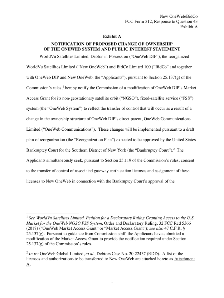 OF THE OneWeb SYSTEM AND PUBLIC INTEREST STATEMENT