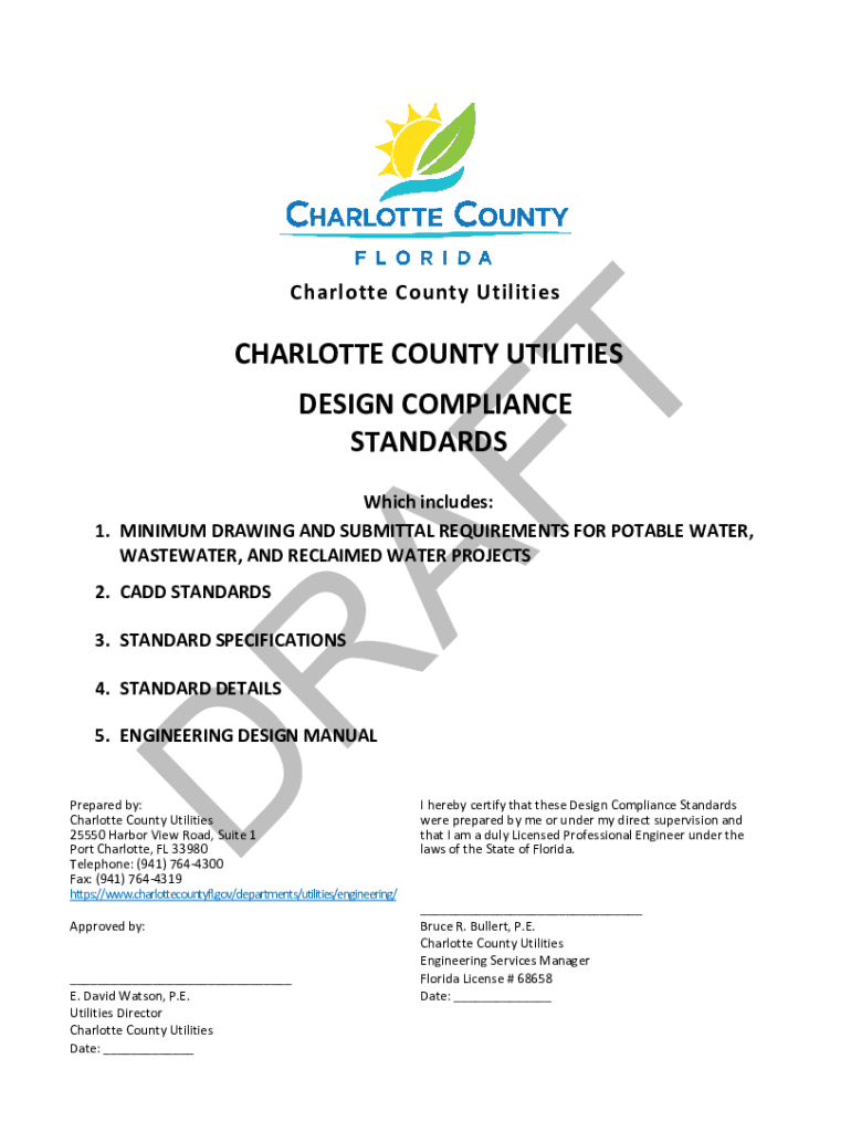 Charlotte County UtilitiesAF TCHARLOTTE COUNTY UTILITIES DESIGN COMPLIANCE STANDARDSWhich includes: 1. MINIMUM DRAWING AND SUBMITTAL REQUIREMENTS FOR POTABLE WATER, WASTEWATER, AND RECLAIMED WATER