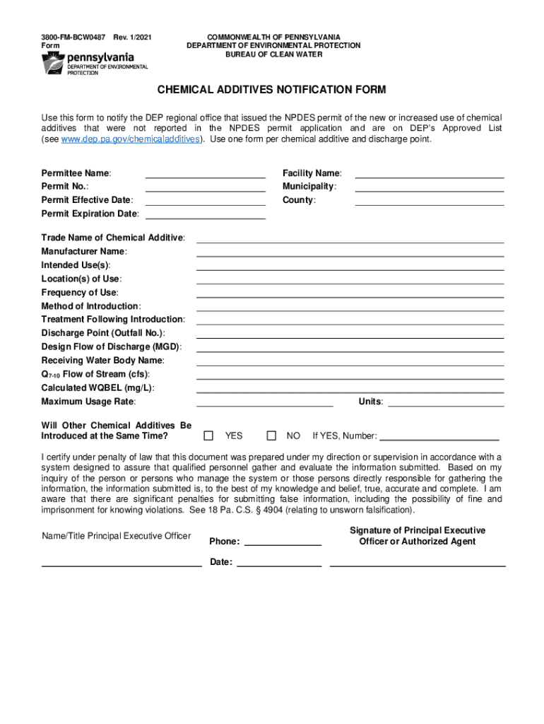 BUREAU OF CLEAN WATERCHEMICAL ADDITIVES NOTIFICATION FORM