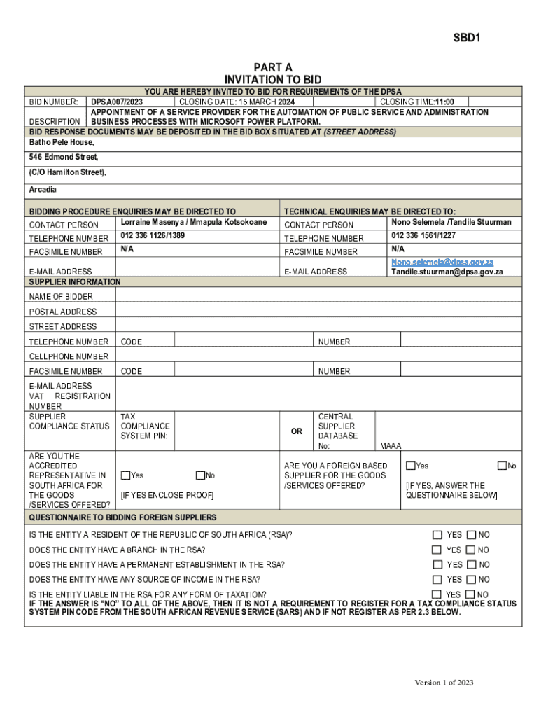 SBD1 PART A INVITATION TO BID YOU ARE HEREBY INVITED TO BID FOR REQUIREMENTS OF THE DPSA DPSA007/2023 CLOSING DATE: 15 MARCH 2024 CLOSING TIME:11:00 APPOINTMENT OF A SERVICE PROVIDER FOR THE AUTOMATION