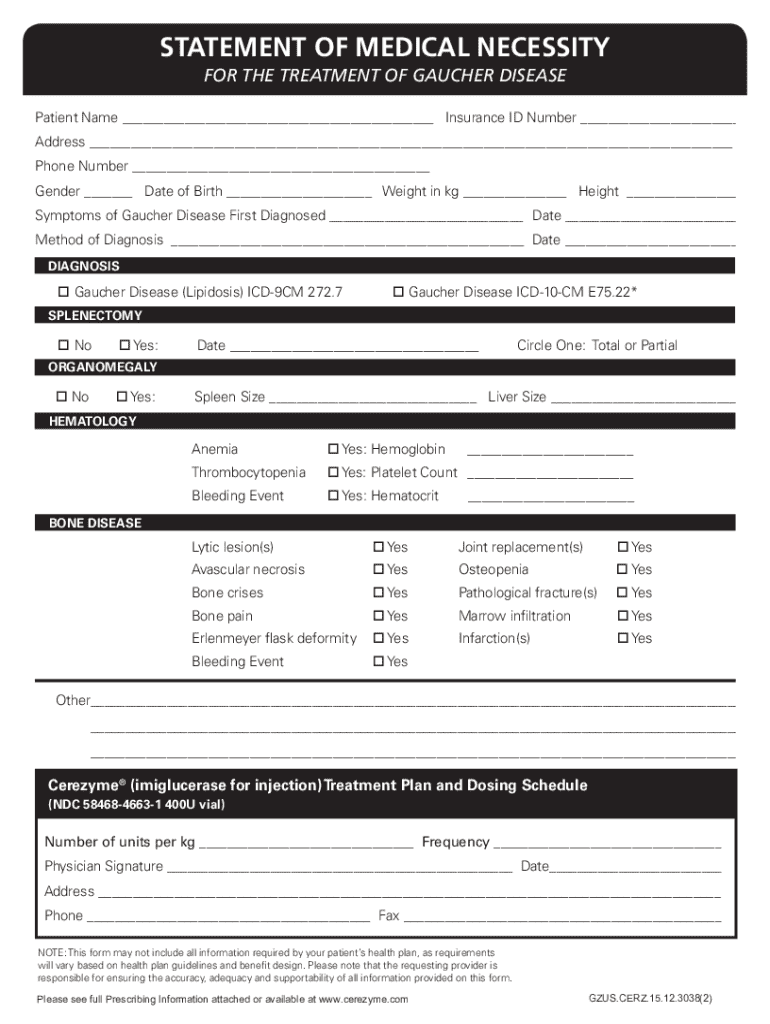 STATEMENT OF MEDICAL NECESSITY FOR THE TREATMENT OF GAUCHER DISEASE Patient Name ___ Insurance ID Number ___ Address ___ Phone Number ___ Gender ___ Date of Birth ___ Weight in kg ___ Height ___ Symptoms