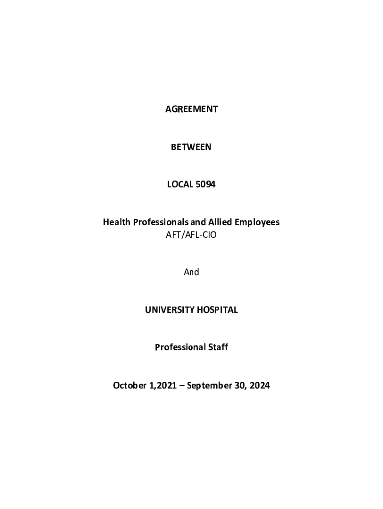 AGREEMENTBETWEENLOCAL 5094Health Professionals and Allied Employees AFT/AFLCIOAndUNIVERSITY HOSPITALProfessional StaffOctober 1,2021 September 30, 2024TABLE OF CONTENTS Page 1. AGREEMENT SCOPE ............................................................................................................