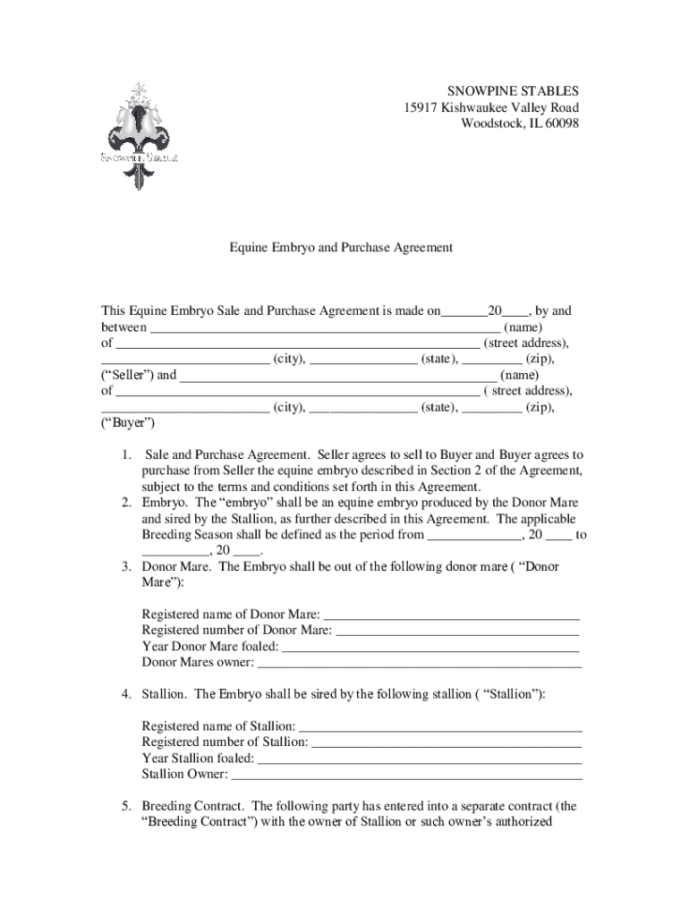 Woodstock, IL 60098Equine Embryo and Purchase Agreements Equine Embryo Sale and Purchase Agreement is made on___20___, by and