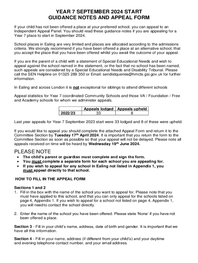 YEAR 7 SEPTEMBER 2024 START GUIDANCE NOTES AND APPEAL FORM If your child has not been offered a place at your preferred school, you can appeal to an Independent Appeal Panel. You should read these