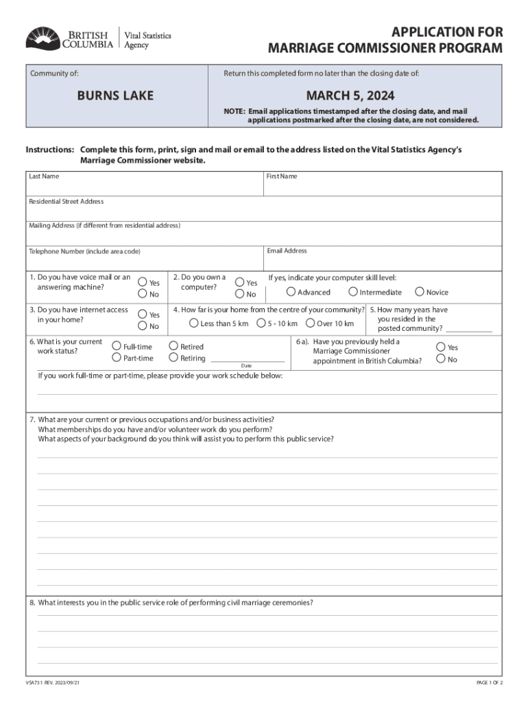 Get the free BURNS LAKE. Application for Marriage Commissioner Program