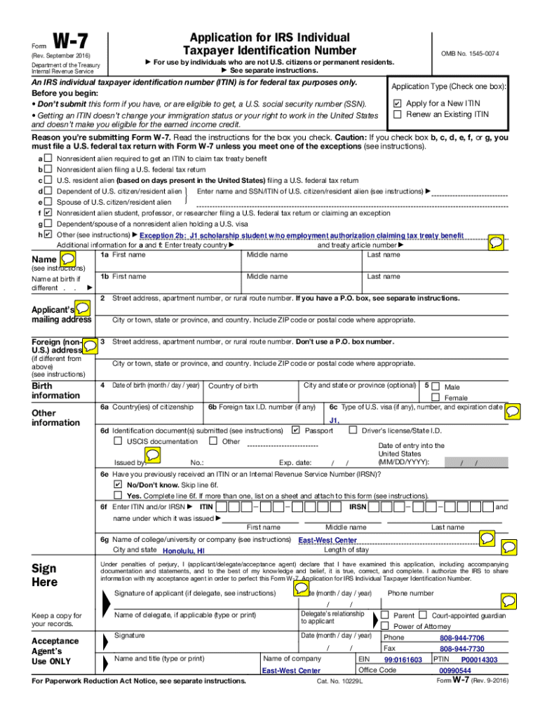 FormW7Application for IRS Individual Taxpayer Identification Number(Rev. September 2016) Department of the Treasury Internal Revenue Service OMB No. 15450074For use by individuals who are not U.S.