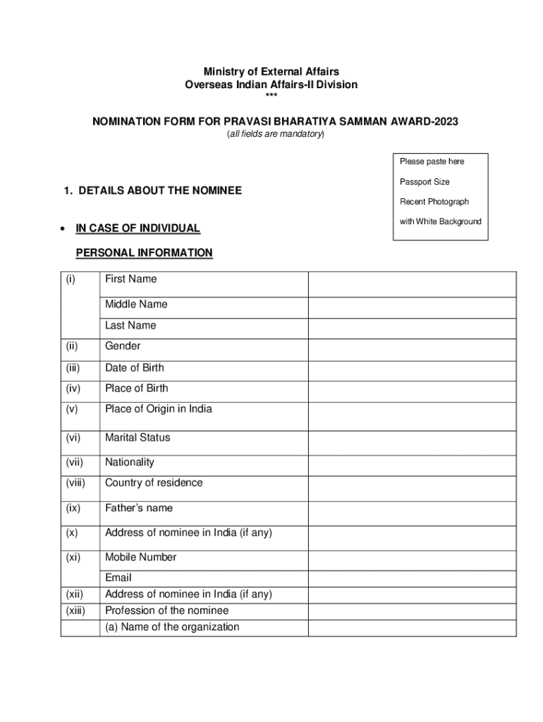 Ministry of External Affairs Overseas Indian AffairsII Division *** NOMINATION FORM FOR PRAVASI BHARATIYA SAMMAN AWARD2023 (all fields are mandatory) Please paste here Passport Size1. DETAILS ABOUT