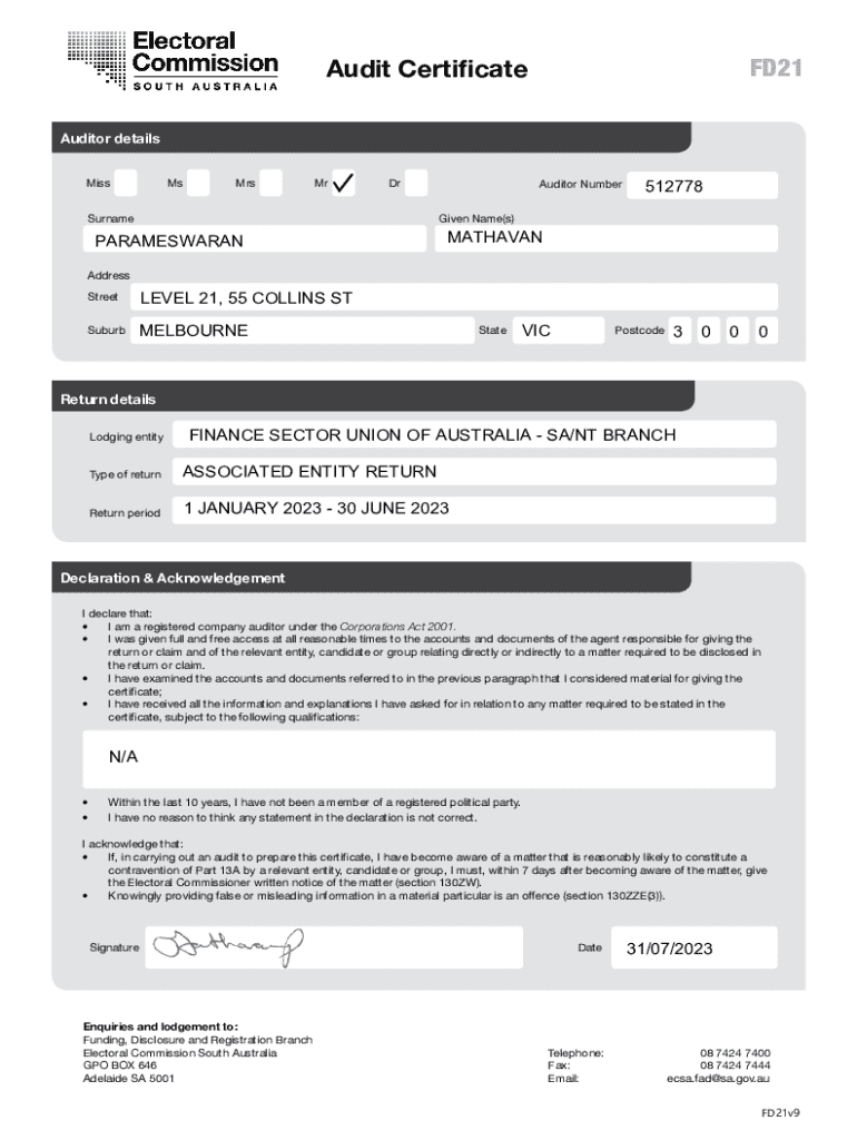 FD21Audit Certificate Auditor details MissMsMrsMrDrSurnameAuditor Number512778Given Name(s)PARAMESWARANMATHAVANAddress StreetLEVEL 21, 55 COLLINS STSuburbMELBOURNEStateVICPostcode3000Return details
