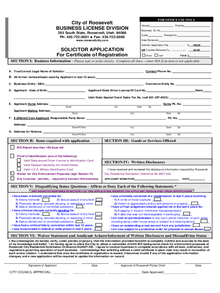 Any individual or business entity intending to conduct business activities within Roosevelt City is required to file for a business license.