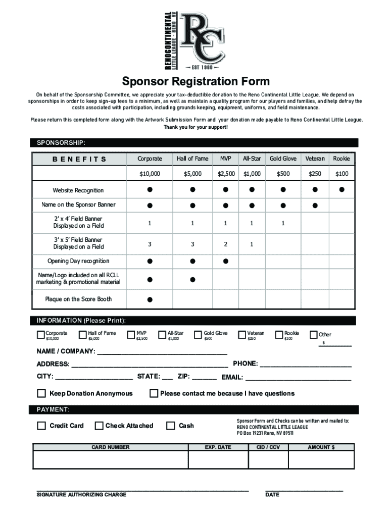 On behalf of the Sponsorship Committee, we appreciate your tax deductible donation to the Reno Continental Little League. We depend on