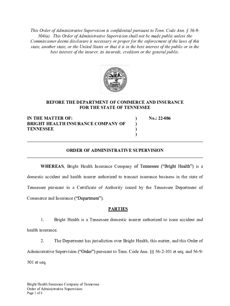 This Order of Administrative Supervision is confidential pursuant to Tenn. Code Ann. 569504(a). This Order of Administrative Supervision shall not be made public unless the