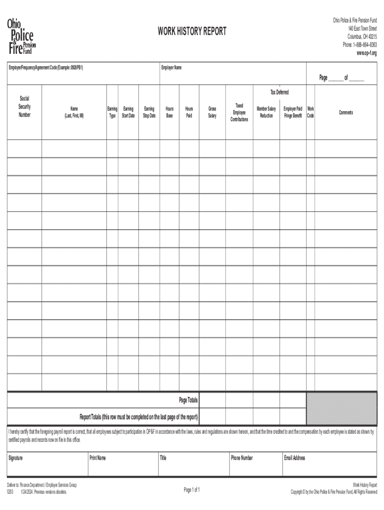 Information required includes personal details, employment history, and contributions made to the Ohio Police and Fire Pension Fund.