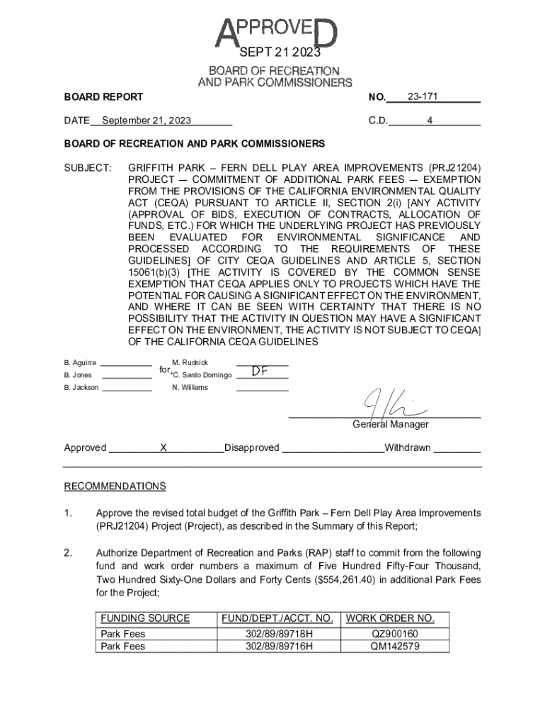 SEPT 21 2023 BOARD REPORTNO.September 21, 2023DATE23171C.D.4BOARD OF RECREATION AND PARK COMMISSIONERS SUBJECT:GRIFFITH PARK FERN DELL PLAY AREA IMPROVEMENTS (PRJ21204) PROJECT COMMITMENT OF ADDITIONAL