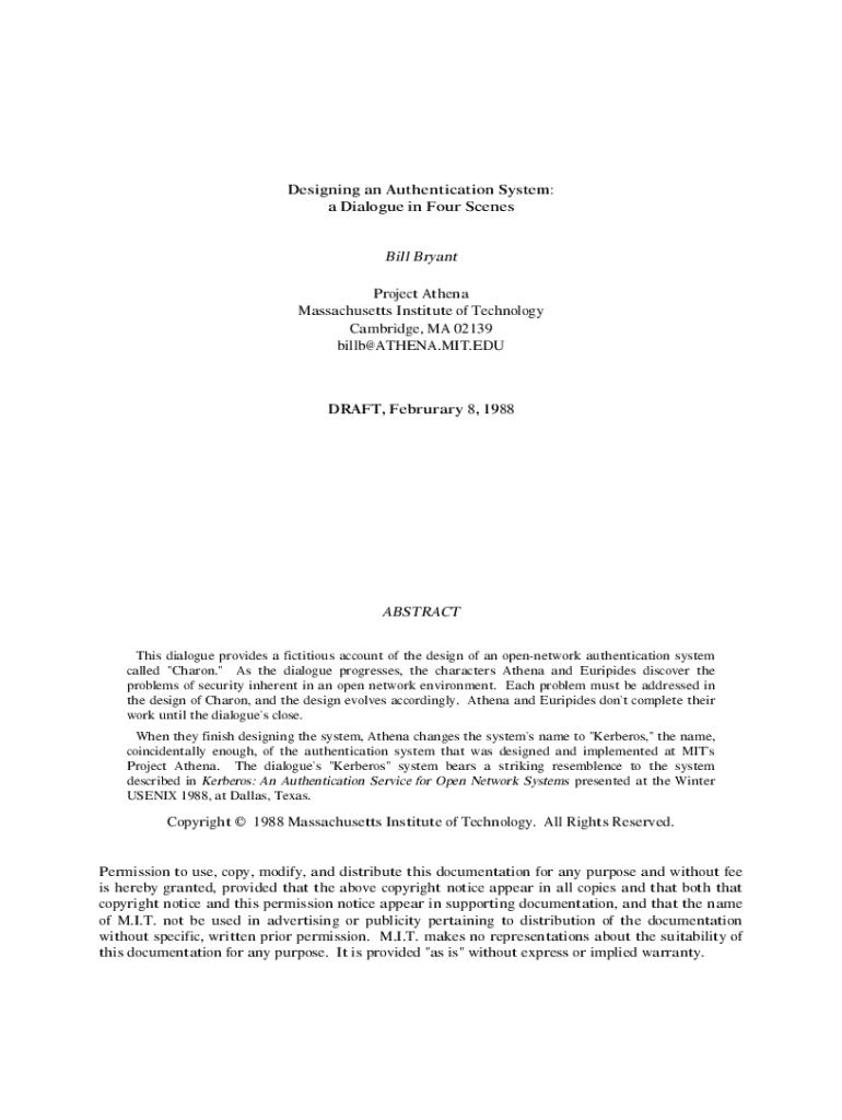 Designing an Authentication System: a Dialogue in Four ScenesBill Bryant Project Athena Massachusetts Institute of Technology Cambridge, MA 02139 billb@ATHENA.MIT.EDUDRAFT, Februrary 8, 1988ABSTRACT