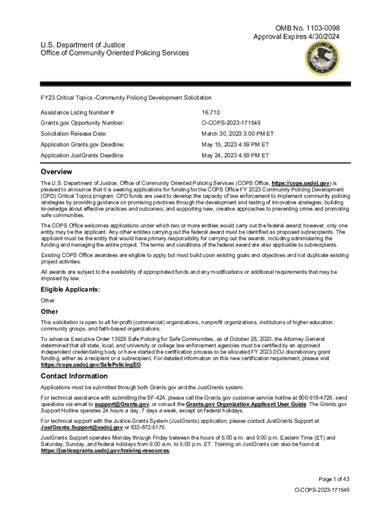 Office of Community Oriented Policing ServicesFY23 Critical Topics Community Policing Development Solicitation