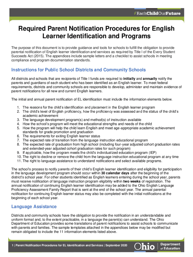 Required Parent Notification Procedures for English Learner Identification and Programs The purpose of this document is to provide guidance and tools for schools to fulfill the obligation to provide