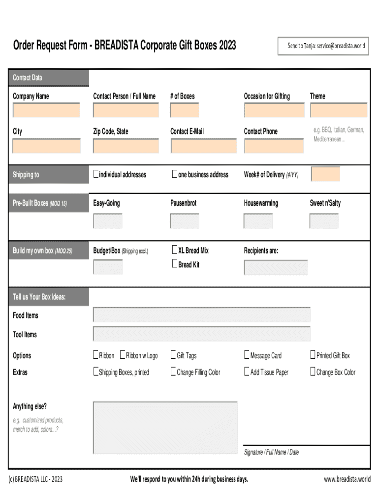 Order Request Form BREADISTA Corporate Gift Boxes 2023Send to Tanja: service@breadista.worldContact Data Company NameContact Person / Full Name# of BoxesOccasion for GiftingCityZip Code, StateContact
