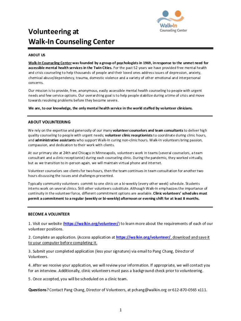 Volunteering at WalkIn Counseling Center ABOUT US WalkIn Counseling Center was founded by a group of psychologists in 1969, in response to the unmet need for accessible mental health services in the