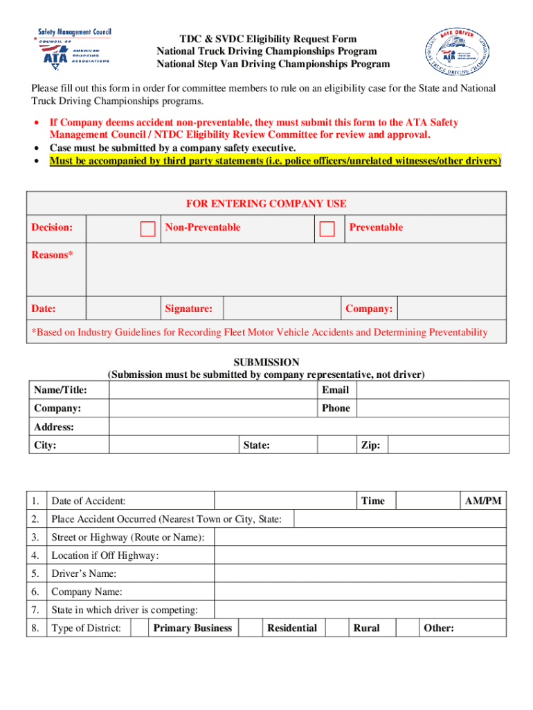 TDC & SVDC Eligibility Request Form National Truck Driving Championships Program National Step Van Driving Championships Program Please fill out this form in order for committee members to rule on