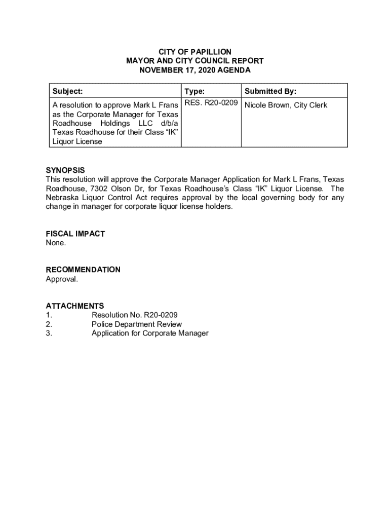 A resolution to approve Mark L Fran's RES. R200209 Nicole Brown, City Clerk