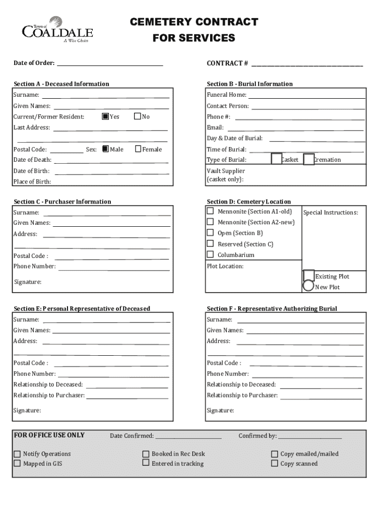 Date of Order: ___CONTRACT # ___Section A Deceased InformationSection B Burial InformationSurname:Funeral Home:Given Names:Current/Former Resident:Last Address: