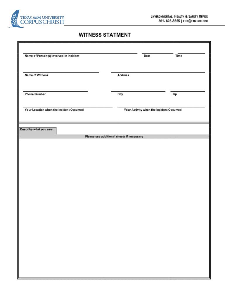 ENVIRONMENTAL, HEALTH & SAFETY OFFICE 361 8255555 | EHS@TAMUCC.EDUWITNESS STATMENTName of Person(s) Involved in IncidentDateName of WitnessAddressPhone NumberCityYour Location when the Incident OccurredTimeZipYour
