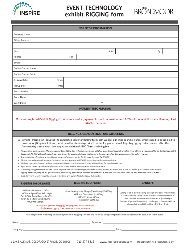 EXHIBITOR INFORMATION Company Name: Billing Address:State:City: Phone:Zip:Fax:Email: On Site Contact Name: On Site Contact Cell #: Delivery Date:Time:Pickup Date:Time:Booth Number: Event Name: Event