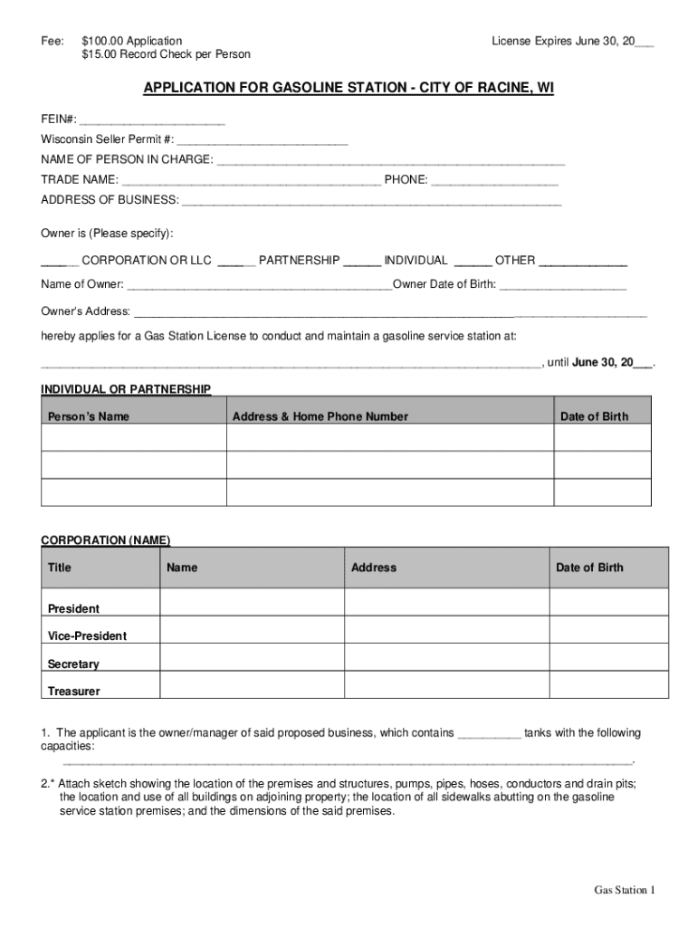 $15.00 Record Check per PersonLicense Expires June 30, 20___APPLICATION FOR GASOLINE STATION CITY OF RACINE, WI