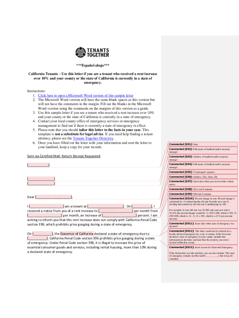 California Tenants Use this letter if you are a tenant who received a rent increase