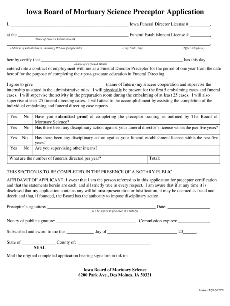 Iowa Board of Mortuary Science Preceptor Application I, at theIowa Funeral Director License #,Funeral Establishment License #,(Name of Funeral Establishment), (Address of Establishment, including