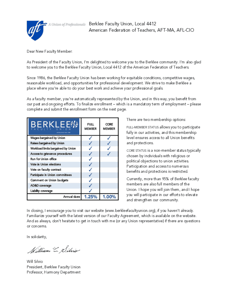 As President of the Faculty Union, I'm delighted to welcome you to the Berk lee community.