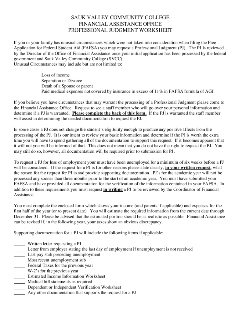 SAUK VALLEY COMMUNITY COLLEGE FINANCIAL ASSISTANCE OFFICE PROFESSIONAL JUDGMENT WORKSHEET If you or your family has unusual circumstances which were not taken into consideration when filing the Free
