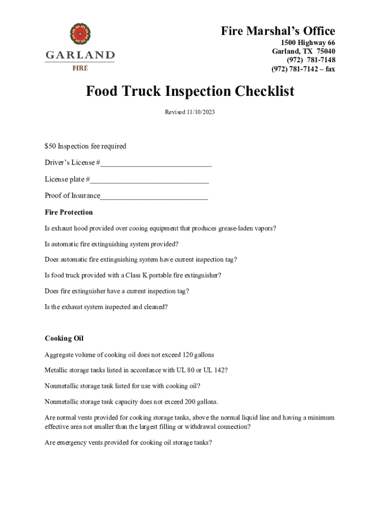 Fire Marshals Office 1500 Highway 66 Garland, TX 75040 (972) 7817148 (972) 7817142 Foxwood Truck Inspection Checklist Revised 11/10/$202350 Inspection fee required Driver's License #___ License plate