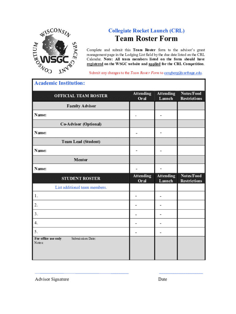 Collegiate Rocket Launch (CRL)Team Roster FormComplete and submit this Team Roster form to the advisors grant