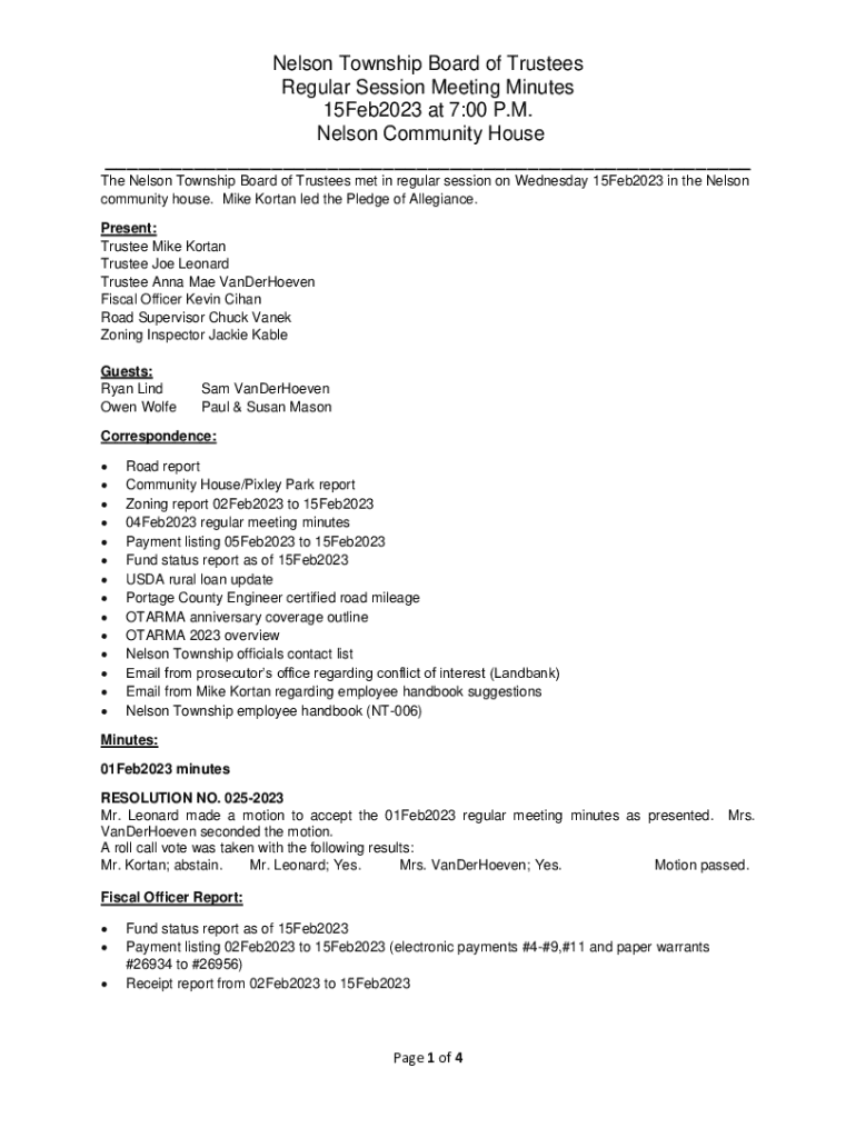 The Nelson Township Board of Trustees met in regular session on Wednesday 15Feb2023