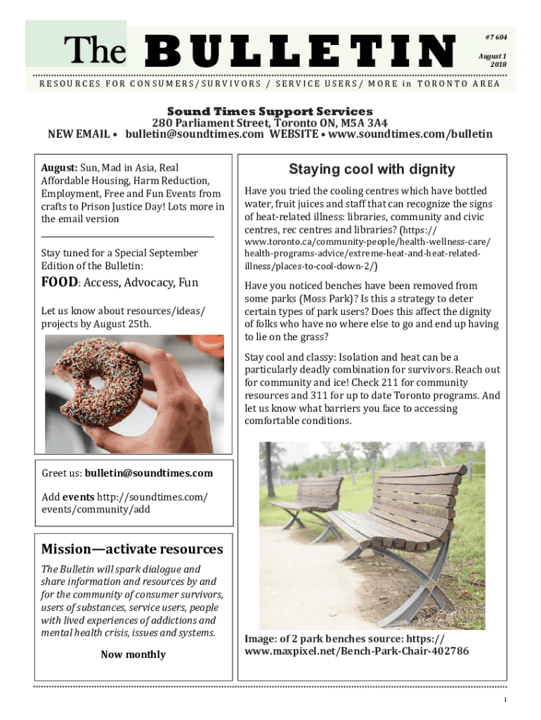 Bulletin#7 604August 12018RESOURCES FOR CONSUMERS/SURVIVORS / SERVICE USERS/ MORE in TORONTO Resound Times Support Services 280 Parliament Street, Toronto ON, M5A 3A4NEW EMAIL bulletin@soundtimes.comWEBSITE