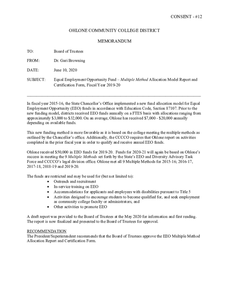 TO:Board of TrusteesFROM:Dr. Gary BrowningDATE:June 10, 2020SUBJECT:Equal Employment Opportunity Fund Multiple Method Allocation Model Report
