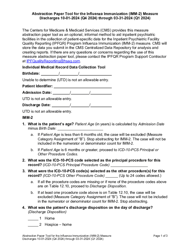 Abstraction Paper Tool for the Influenza Immunization (IMM2) Measure Discharges 10012024 (Q4 2024) through 03312024 (Q1 2024) The Centers for Medicare & Medicaid Services (CMS) provides this measure