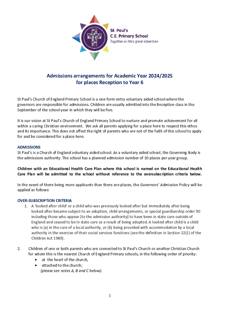 Admissions arrangements for Academic Year 2024/2025 for places Reception to Year 6 St Pauls Church of England Primary School is a one form entry voluntary aided school where the governors are responsible