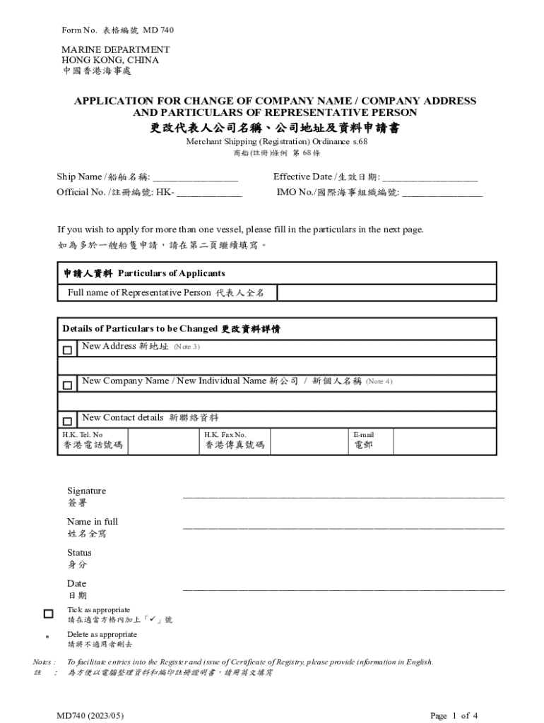 Form No. MD 740MARINE DEPARTMENT HONG KONG, CHINA APPLICATION FOR CHANGE OF COMPANY NAME / COMPANY ADDRESS AND PARTICULARS OF REPRESENTATIVE PERSON Merchant Shipping (Registration) Ordinance s.68
