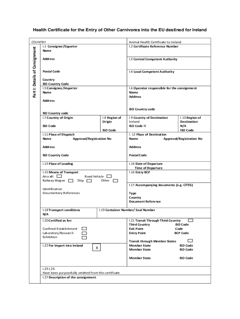 Health Certificate for the Entry of Other Carnivores into the EU destined for IrelandPart I: Details of ConsignmentCOUNTRY