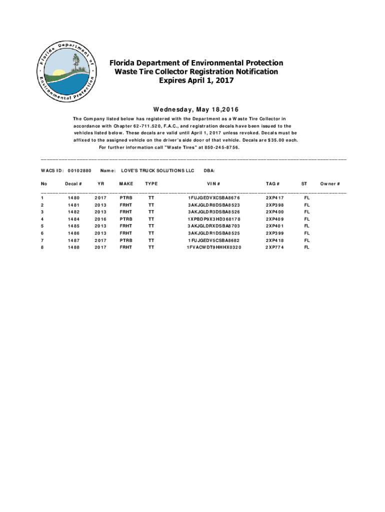 Florida Department of Environmental Protection Waste Tire Collector Registration Notification Expires April 1, 2017Wednesday, May 18, 2016 The Company listed below has registered with the Department