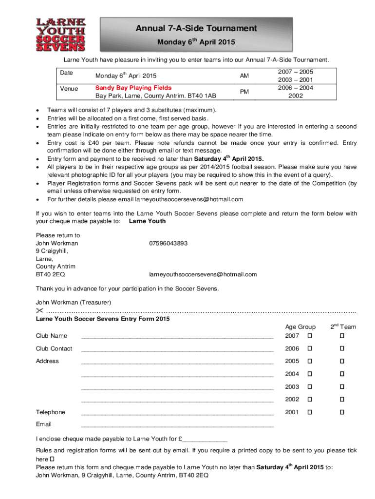Large Youth have pleasure in inviting you to enter teams into our Annual 7ASide Tournament.